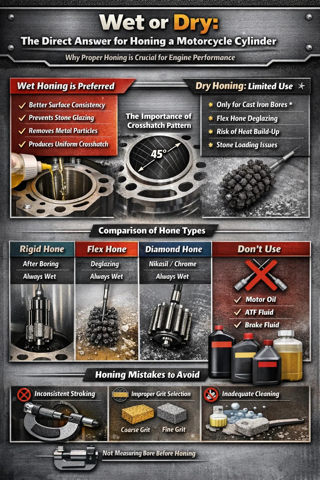 Prilikom brušenja a cilindar motocikla , mokro honanje je preporučena metoda u većini situacija . Korištenje ulja za honanje ili laganog maziva na bazi petroleja tijekom procesa uklanja metalne čestice, održava brušenje čistim, sprječava glazuru na abrazivnom kamenju i stvara konzistentniji šablon na stjenci otvora. Suho honanje koristi se samo u vrlo specifičnim scenarijima — obično s određenim fleksibilnim brusnim četkama na provrtima od lijevanog željeza — pa čak i tada iskusni strojari često preferiraju barem laganu maglicu maziva.