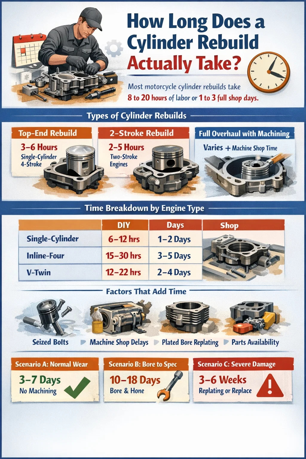 Za većinu cilindar motocikla obnove, trebali biste planirati 8 do 20 sati rada ako posao radite sami ili grubo 1 do 3 puna radna dana ako se posao preda profesionalnom mehaničaru. Taj je raspon namjerno širok — stvarno vrijeme uvelike ovisi o vrsti motora, stanju cilindra, je li potreban rad u radionici i dostupnosti dijelova.