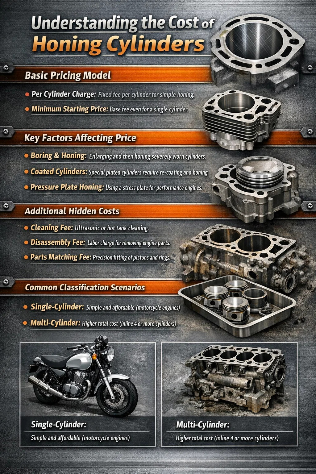 Utjecaj materijala za oblaganje: Mnogi moderni cilindri za motocikle imaju poseban tvrdi premaz iznutra (kao što je kompozitni premaz na bazi nikla). Ovi se cilindri ne mogu izravno brusiti; često zahtijevaju skidanje starog premaza, ponovno galvaniziranje i zatim brušenje, što je vrlo skup proces.