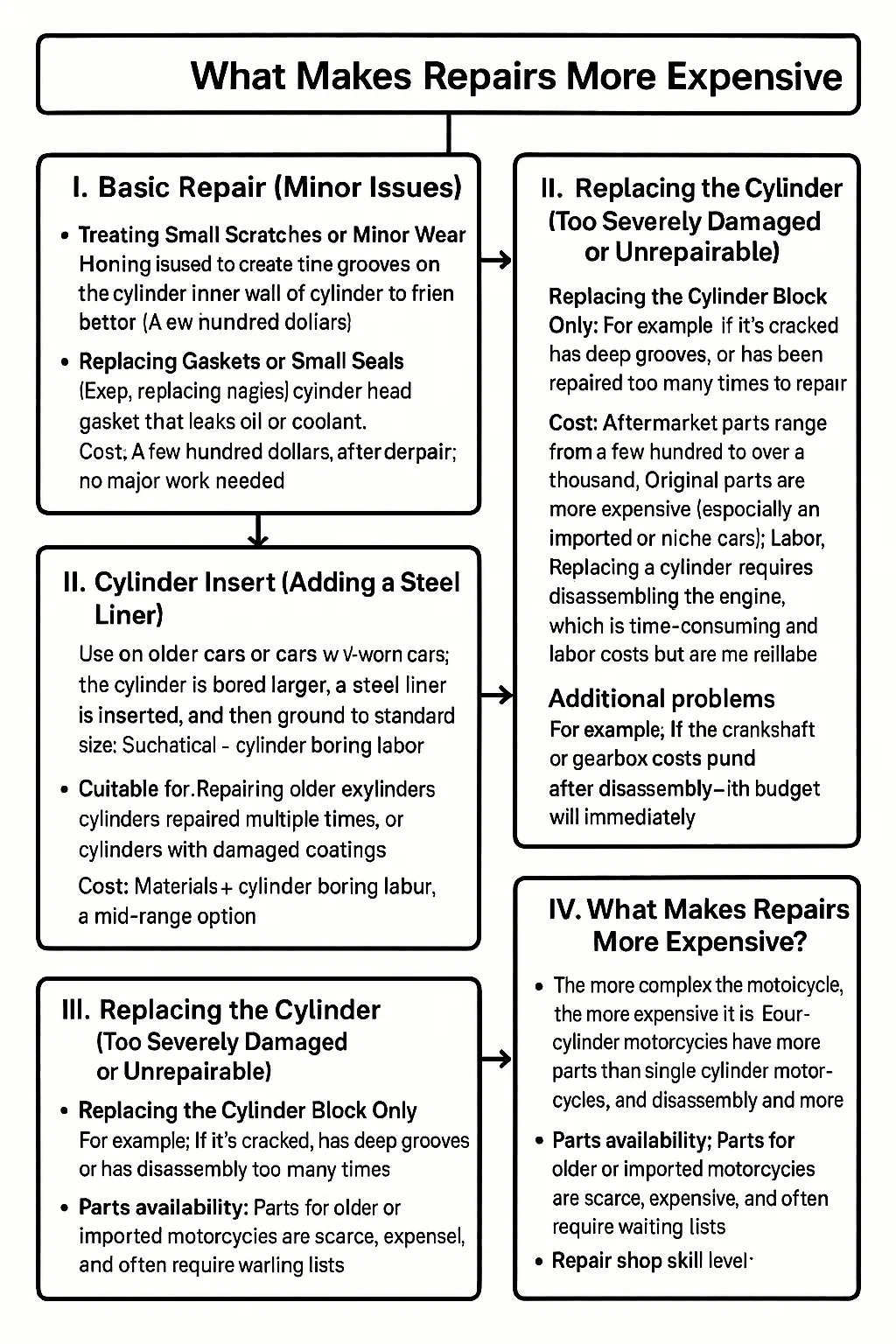 Trošak popravka a cilindar motocikla ovisi prvenstveno o težini problema, vrsti potrebnog popravka i strukturi motocikla. U nastavku su objašnjenja uobičajenih situacija: