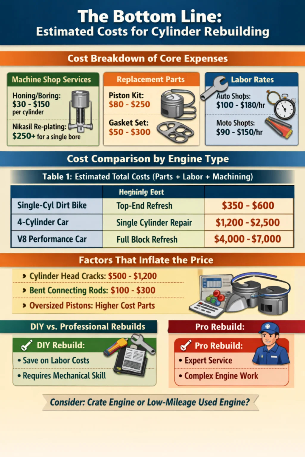 Ako imate alate i servisni priručnik, DIY ponovna izgradnja a cilindar motocikla je održiv način da uštedite otprilike 500 dolara rada . I dalje trebate platiti radionici za precizne radove, ali vi obavljate "podmazivanje". Međutim, za moderne automobile sa složenim podešavanjem bregaste osovine iznad glave i uskim prostorima motora, potrebni specijalizirani alati (kutovi zakretnog momenta, brave bregaste osovine) često čine profesionalnu trgovinu sigurnijim, iako skupljim izborom.
