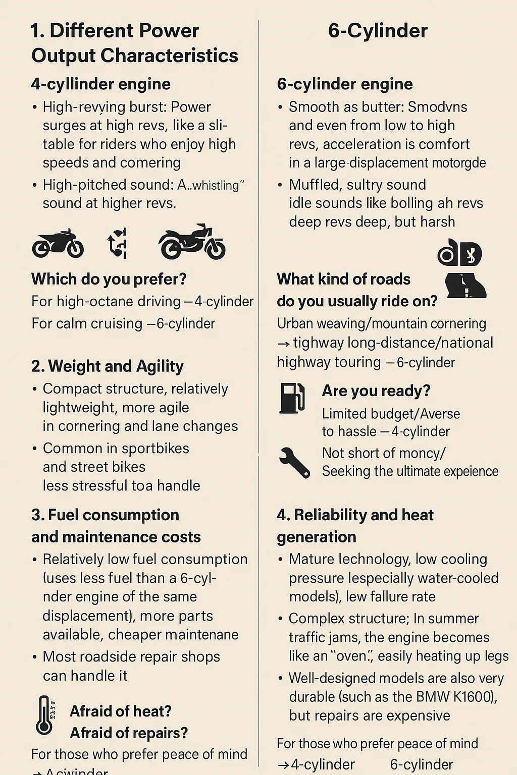 Odabir između 4-cilindričnog i 6-cilindričnog motora za vaš motocikl ovisi o vašoj preferiranoj uporabi i stilu. Evo usporedbe: