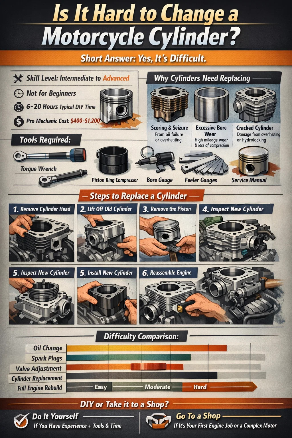 Promjena cilindra motocikla je istinski izazovno, ali apsolutno ostvarivo za pripremljenog, strpljivog kućnog mehaničara. Poteškoća nije u tome što je bilo koji pojedinačni korak tehnički neodoljiv - to je u kumulativnoj preciznosti koja je potrebna u mnogim koracima, od kojih se svaki mora izvršiti ispravno da bi motor nakon toga pouzdano radio.