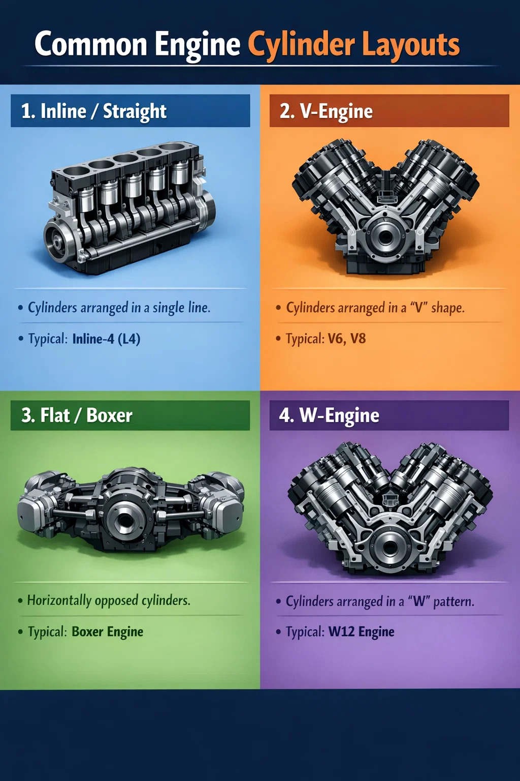 Značajke: Omogućuje ugradnju više cilindara u vrlo mali prostor, što rezultira iznimno snažnim motorima, ali struktura je također vrlo složena. Primjena: Obično se nalazi samo u vrhunskim luksuznim automobilima ili superautomobilima, poput onih s W12 motorima.