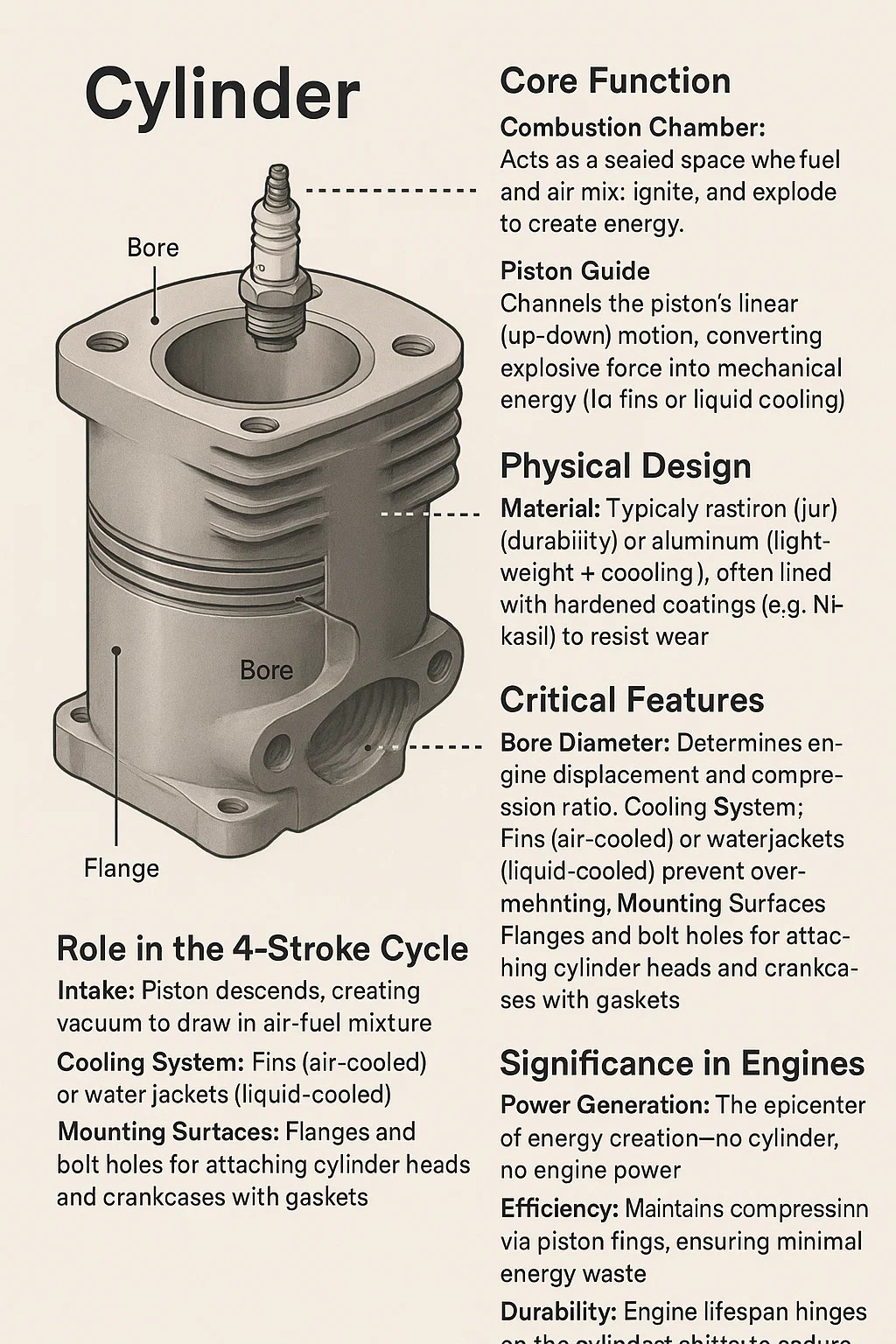 Materijal: Tipično lijevano željezo (izdržljivost) ili aluminij (lagano hlađenje), često obložen očvrslim premazima (npr. Nikasil) za otpornost na trošenje.